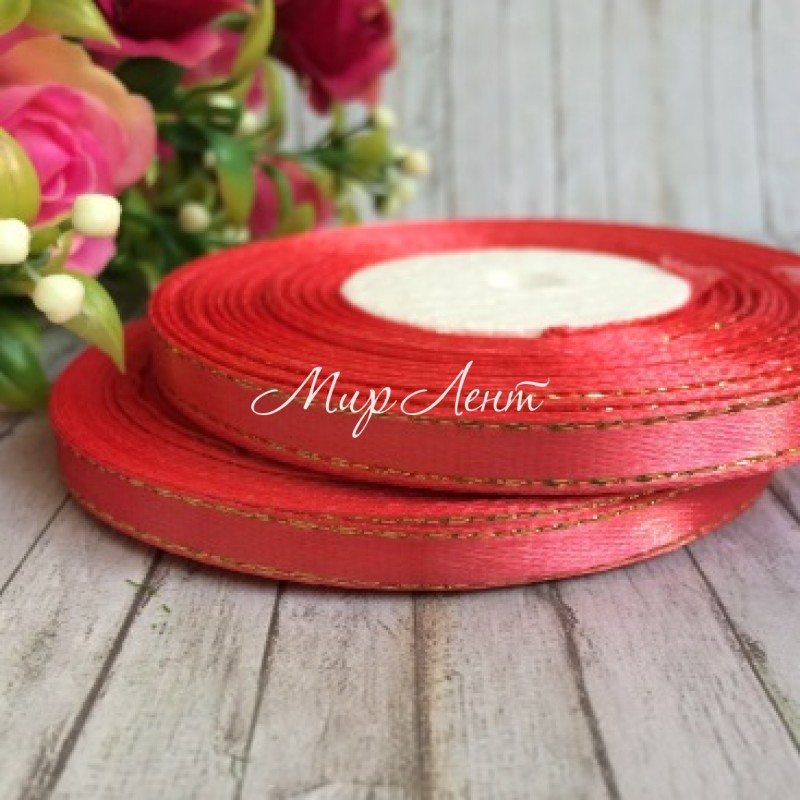 Атлас 0,6 см люрекс золото, коралловый, рулон 33 м