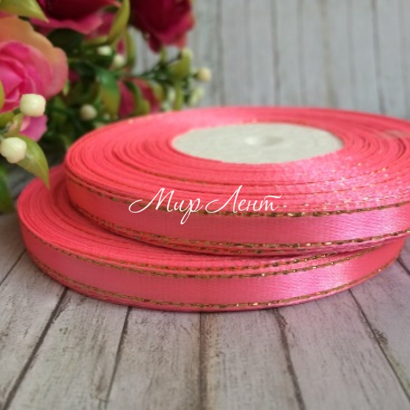 Атлас 0,6 см люрекс золото, ярко-розовый, рулон 33 м