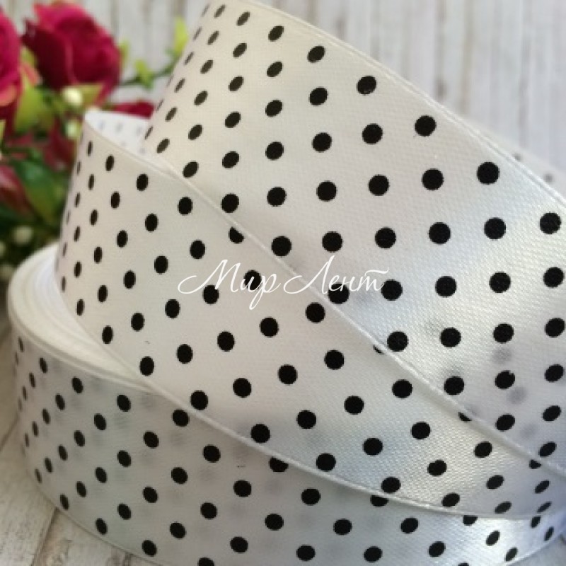 Атлас 2,5 см горох, бело-черный, рулон 18 м