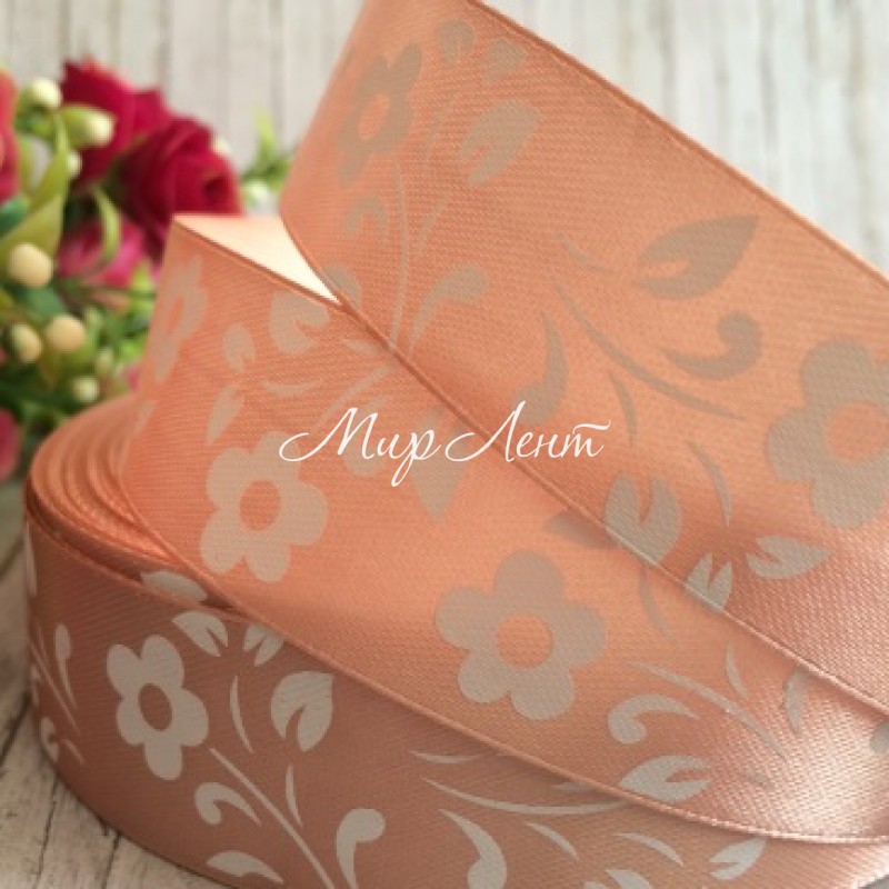 Атлас цветок-листик, 2,5 см, бежево-розовый, рулон 45 м
