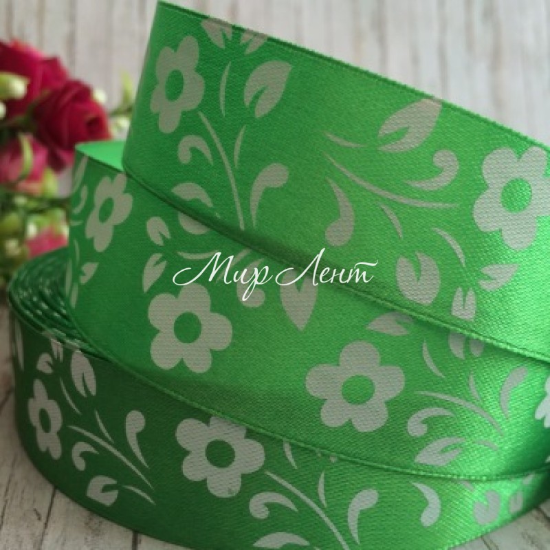 Атлас цветок-листик, 2,5 см, зеленый, рулон 45 м
