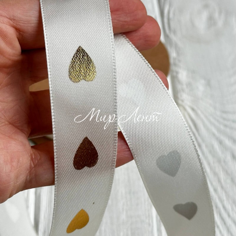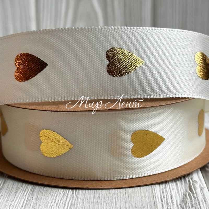 Атлас с золотым рисунком, 2,5 см, молочный с большими сердечками, рулон 18,5 м