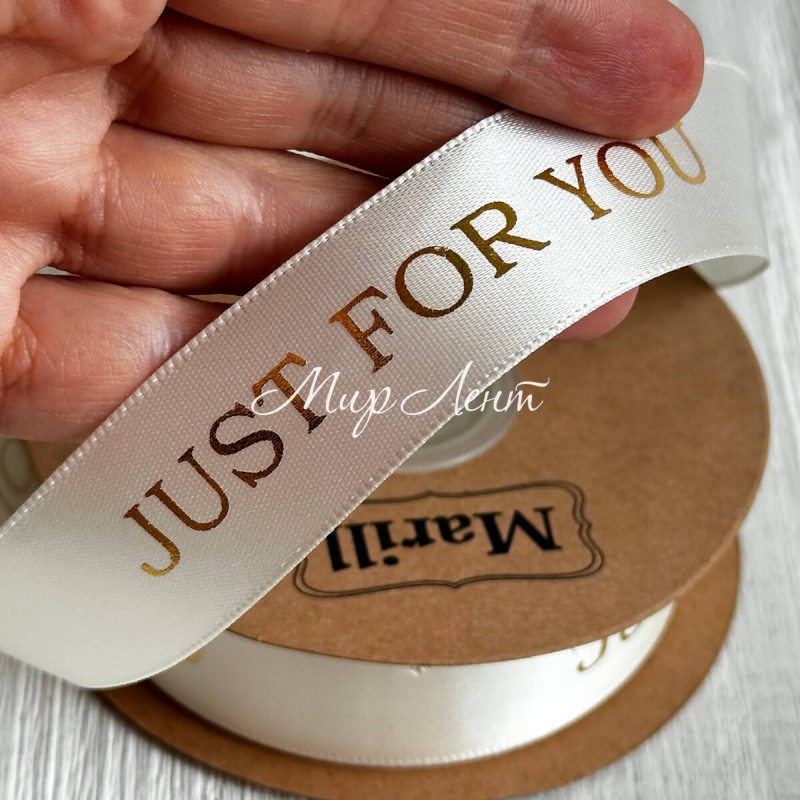 Атлас с золотым рисунком, 2,5 см, молочный с надписью Just for you, рулон 18,5 м