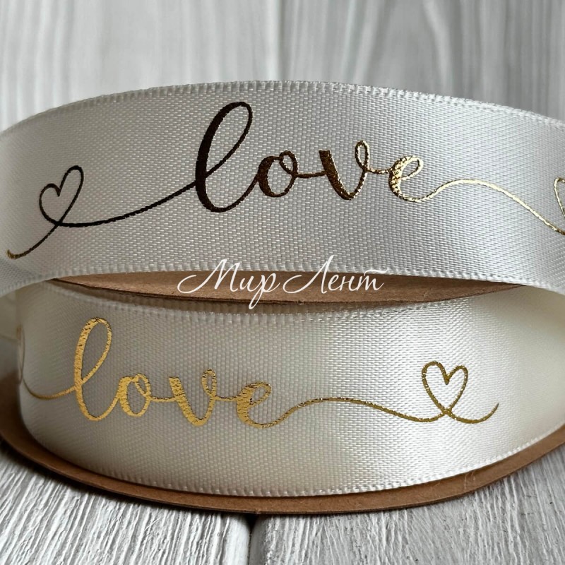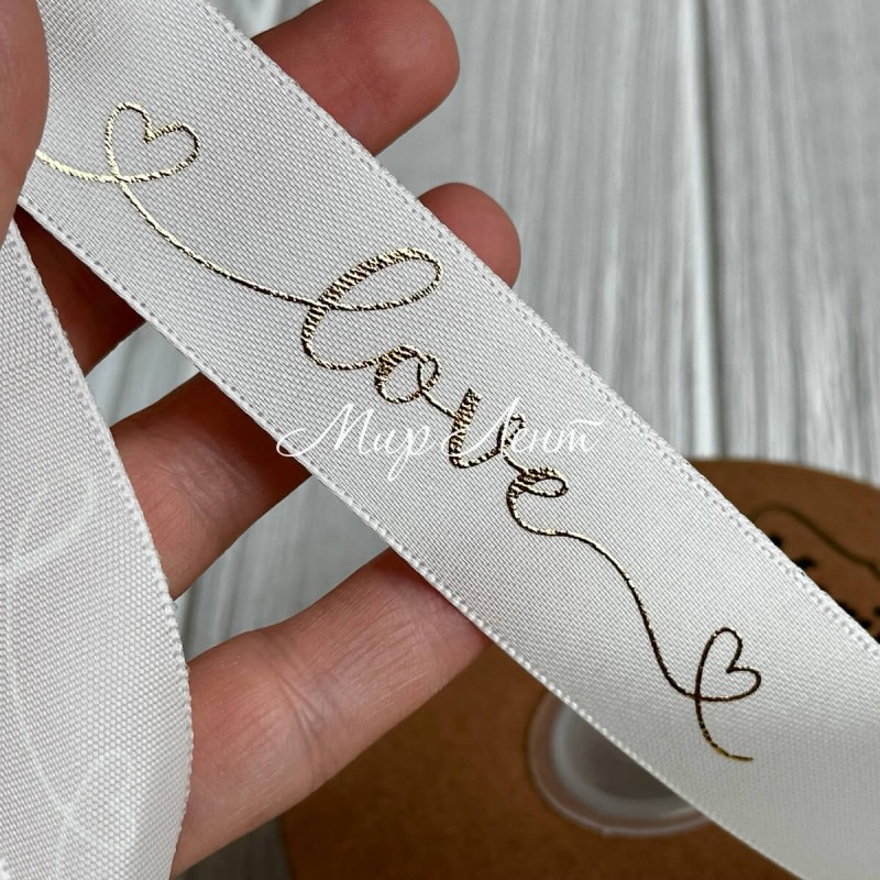 Атлас с золотым рисунком, 2,5 см, молочный с надписью Love, рулон 18,5 м