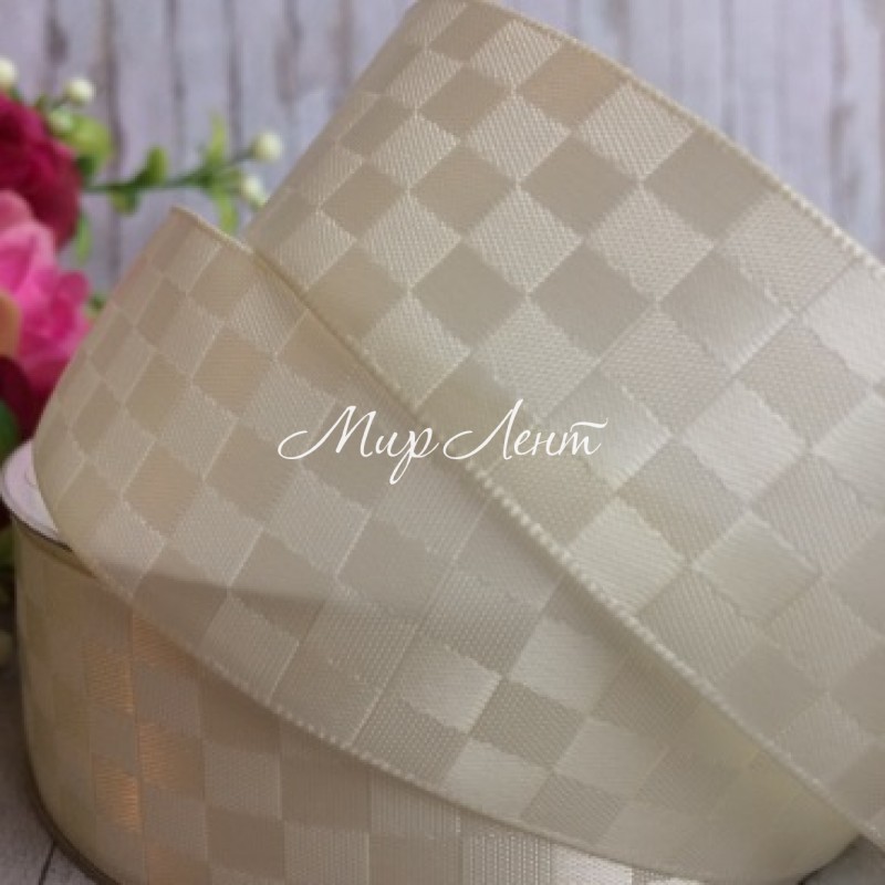Атлас шахматка, 2,5 см, молочный, рулон 23 м