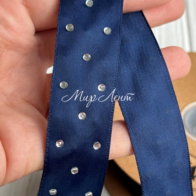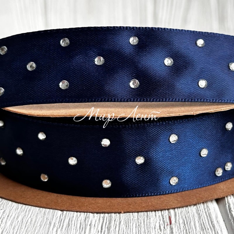 Атлас со стразами, 2,5 см, сапфировый, рулон 18,5 м