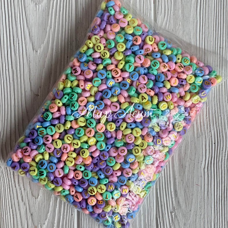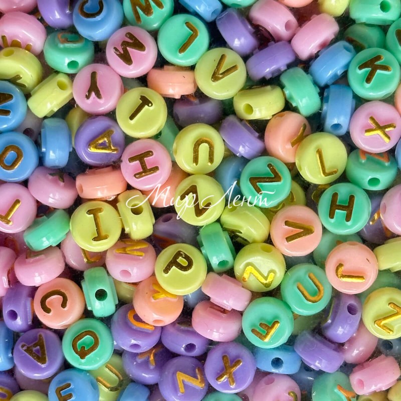 Бусина буква, 10 мм, круг (цветной микс с золотыми буквами), упаковка 500 г