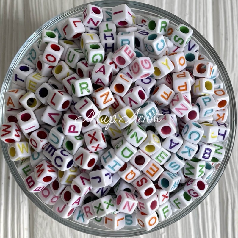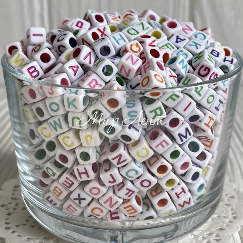 Бусина буква, 6 мм, квадрат (бело-цветной микс), упаковка 500 г