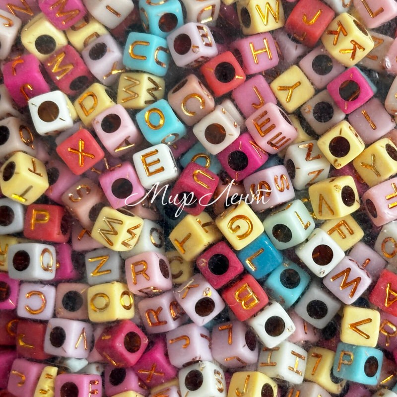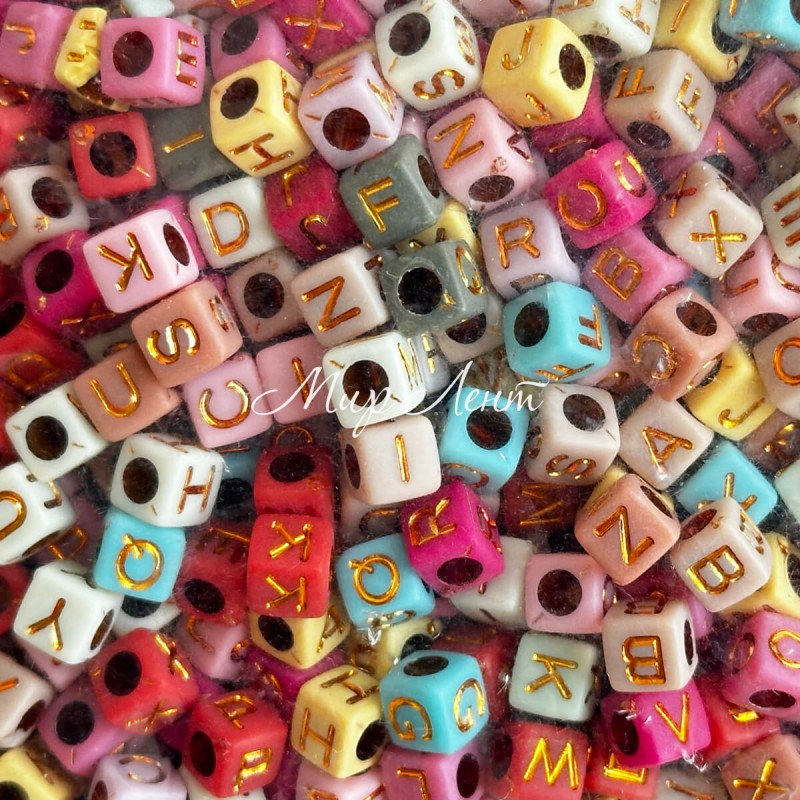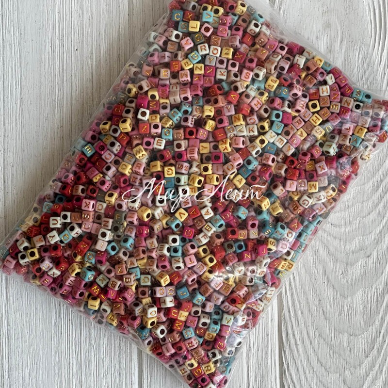 Бусина буква, 6 мм, квадрат (цветной микс с золотыми буквами), упаковка 500 г