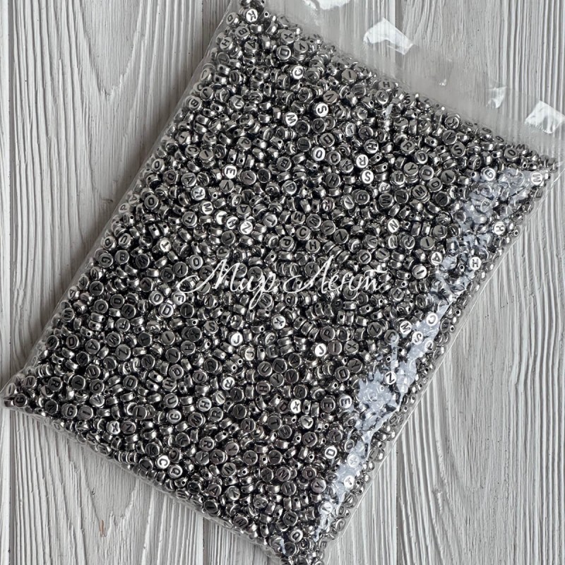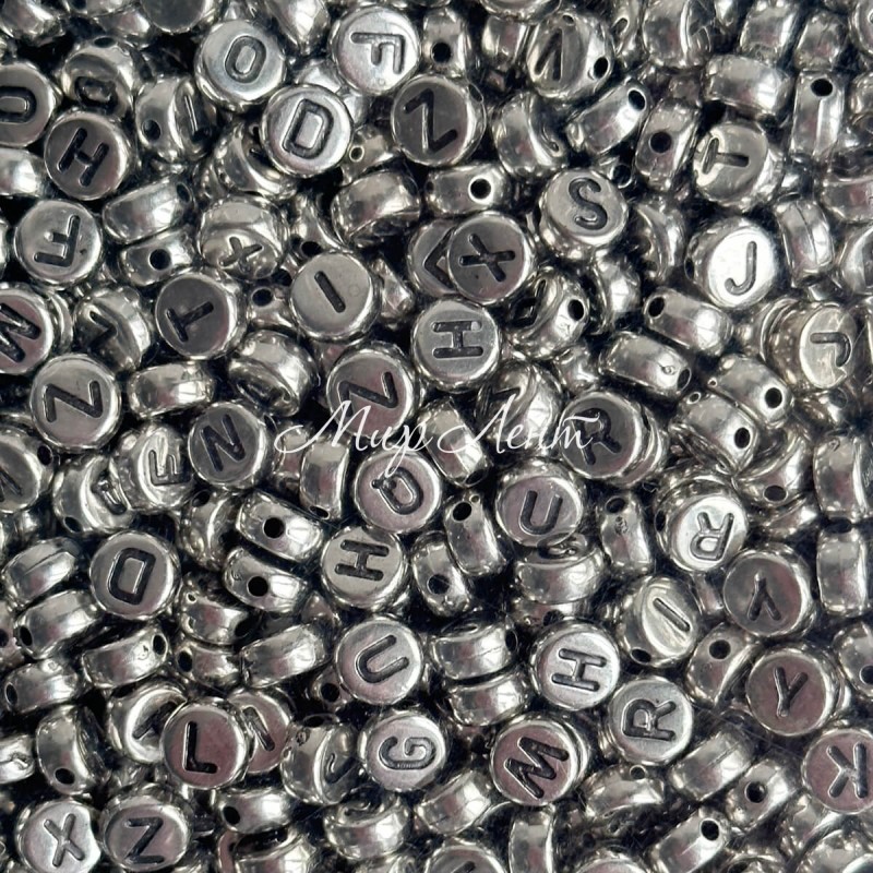 Бусина буква, 7х4 мм, круг (серебро с черными буквами), упаковка 500 г