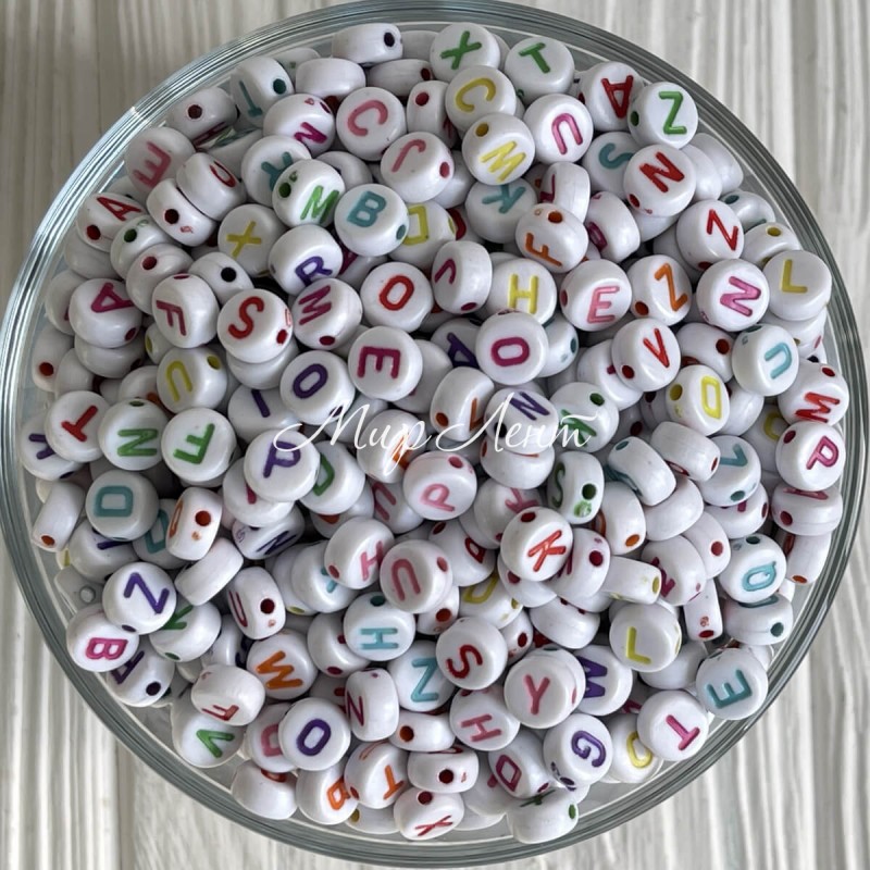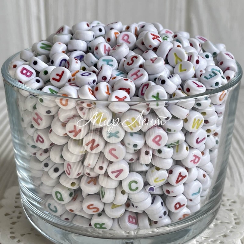 Бусина буква, 8х4 мм, круг (бело-цветной микс), упаковка 500 г