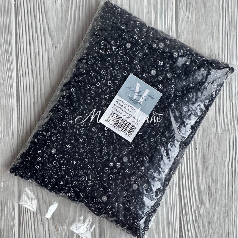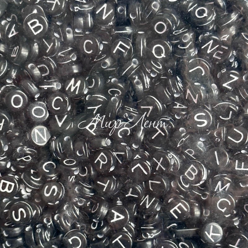 Бусина буква, 7х4 мм, круг (черный с белыми буквами), упаковка 500 г