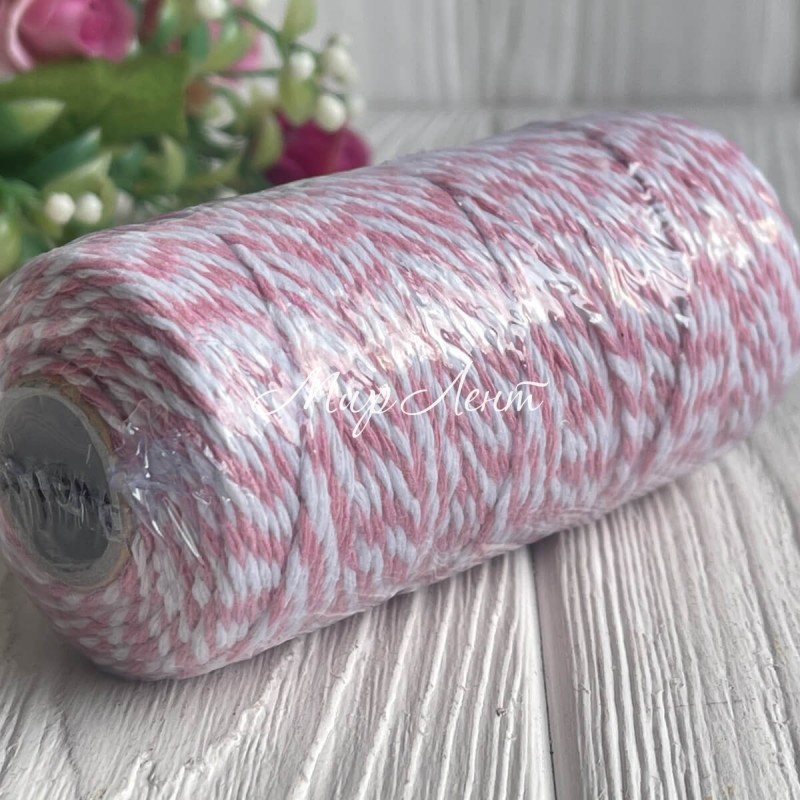 Хлопковый шнур, 2 мм, бело-розовый, рулон 100 м