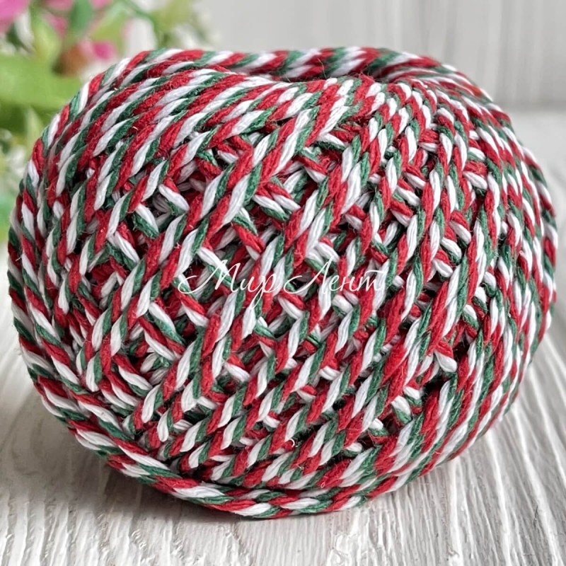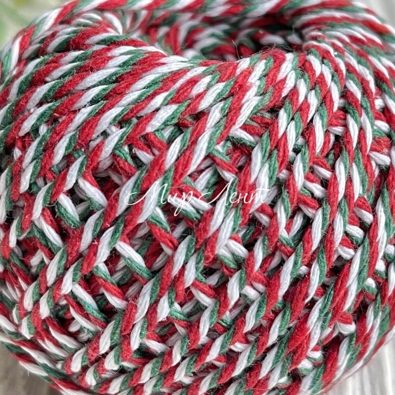 Хлопковый шнур, 2 мм, красно-бело-зеленый, рулон 100 м