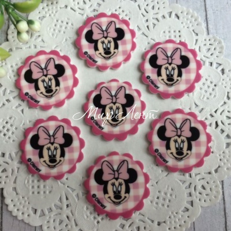 Кабошон круглый, Минни с бантом, 2,6 см, розовая клетка, упаковка 25 шт.