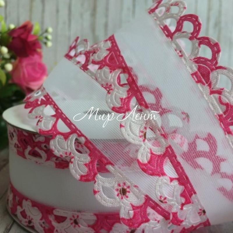 Капроновая лента с ажурным краем, 4 см, бело-малиновая, рулон 18 м