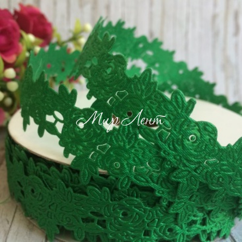 Кружевная лента розочка с листиком, 2,5 см, зеленый, рулон 17,5 м