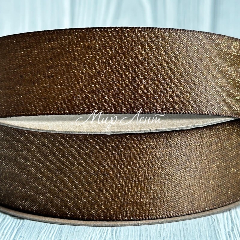 Лента атласная двусторонняя с золотым напылением, 2,5 см, коричневый, рулон 18 м