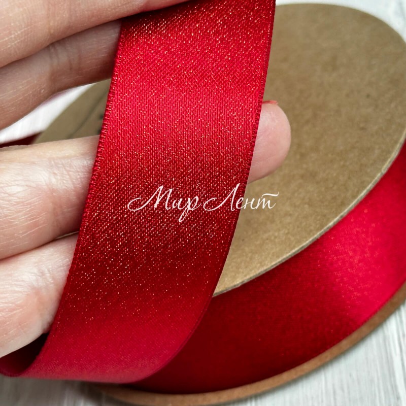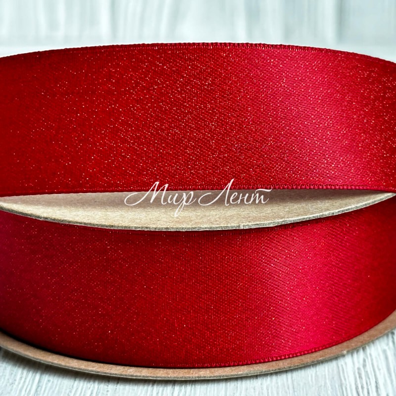 Лента атласная двусторонняя с золотым напылением, 2,5 см, красный, рулон 18 м