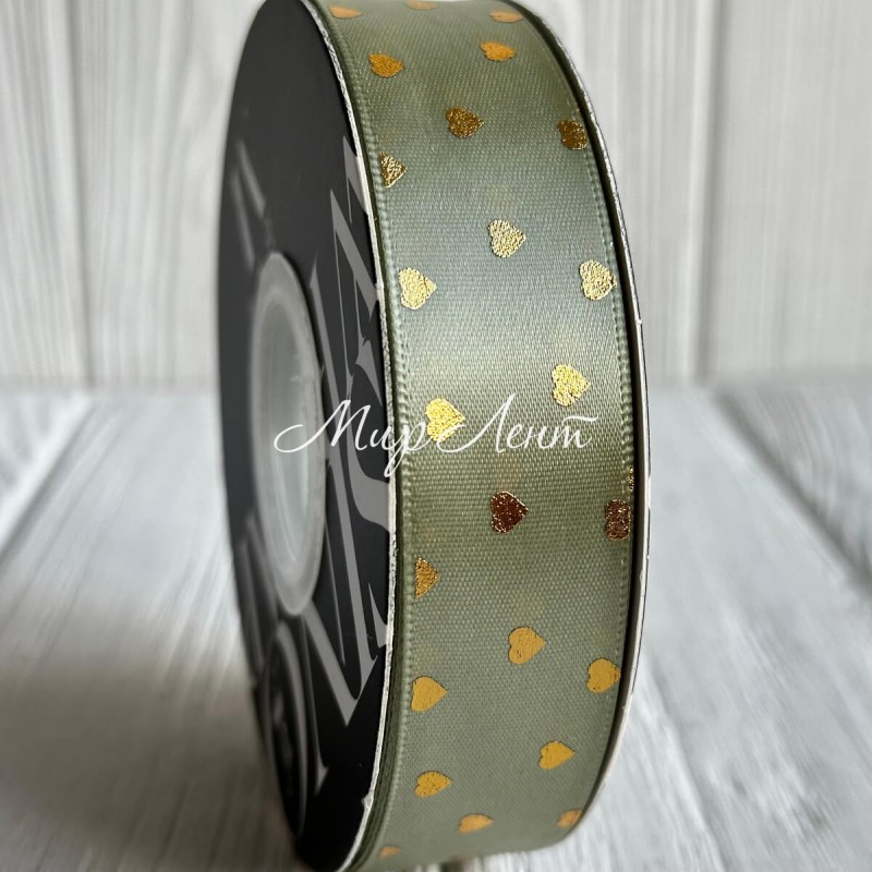 Лента атласная в золотое сердечко, 2,5 см, авокадо, рулон 30 м