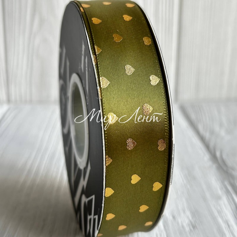 Лента атласная в золотое сердечко, 2,5 см, насыщенно-оливковый, рулон 30 м