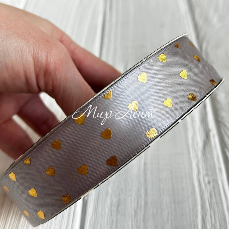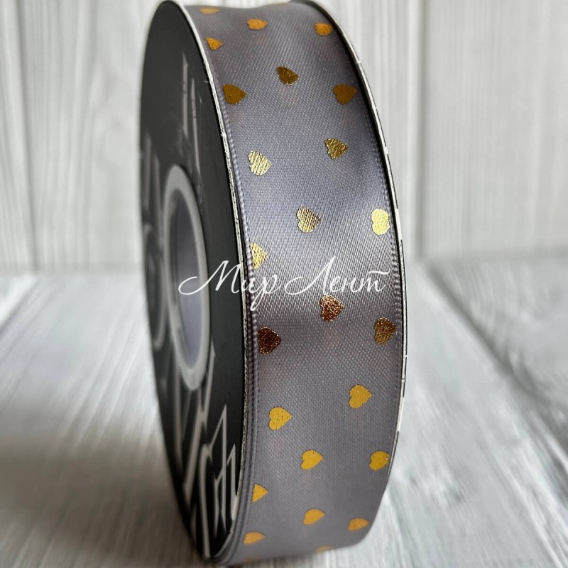 Лента атласная в золотое сердечко, 2,5 см, серый, рулон 30 м