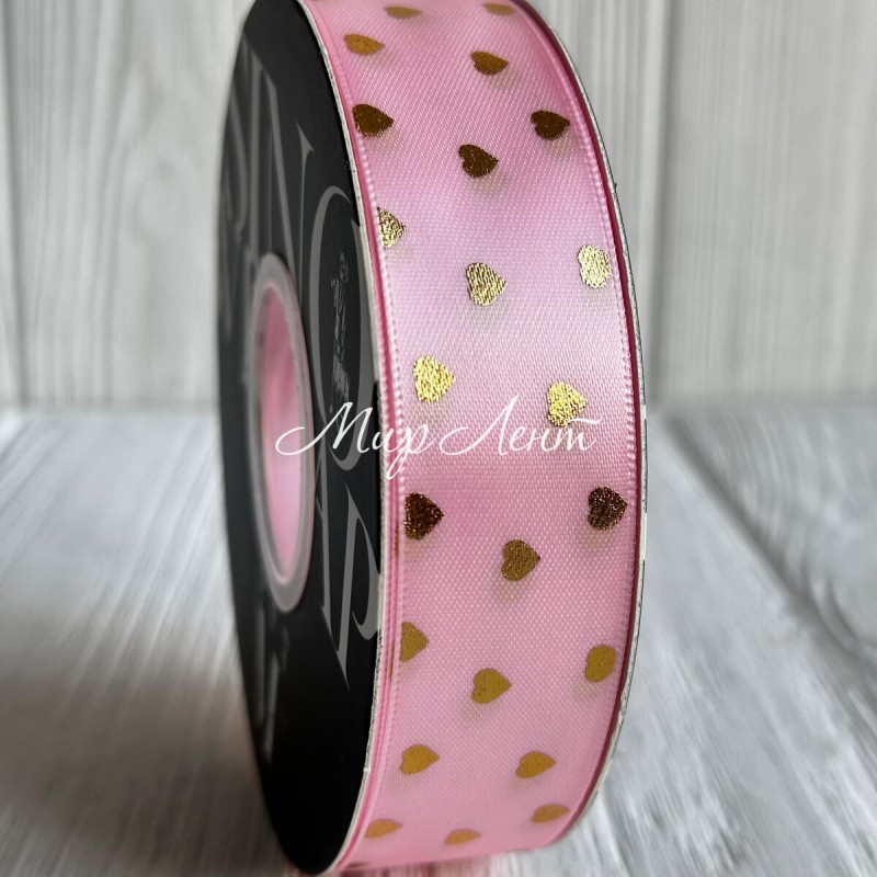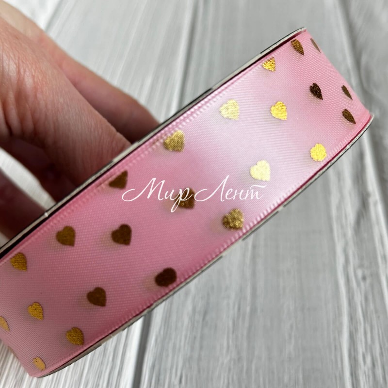 Лента атласная в золотое сердечко, 2,5 см, светло-розовый, рулон 30 м