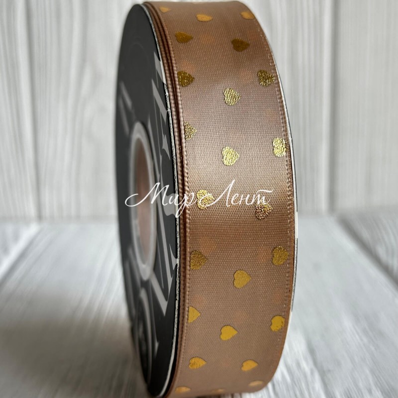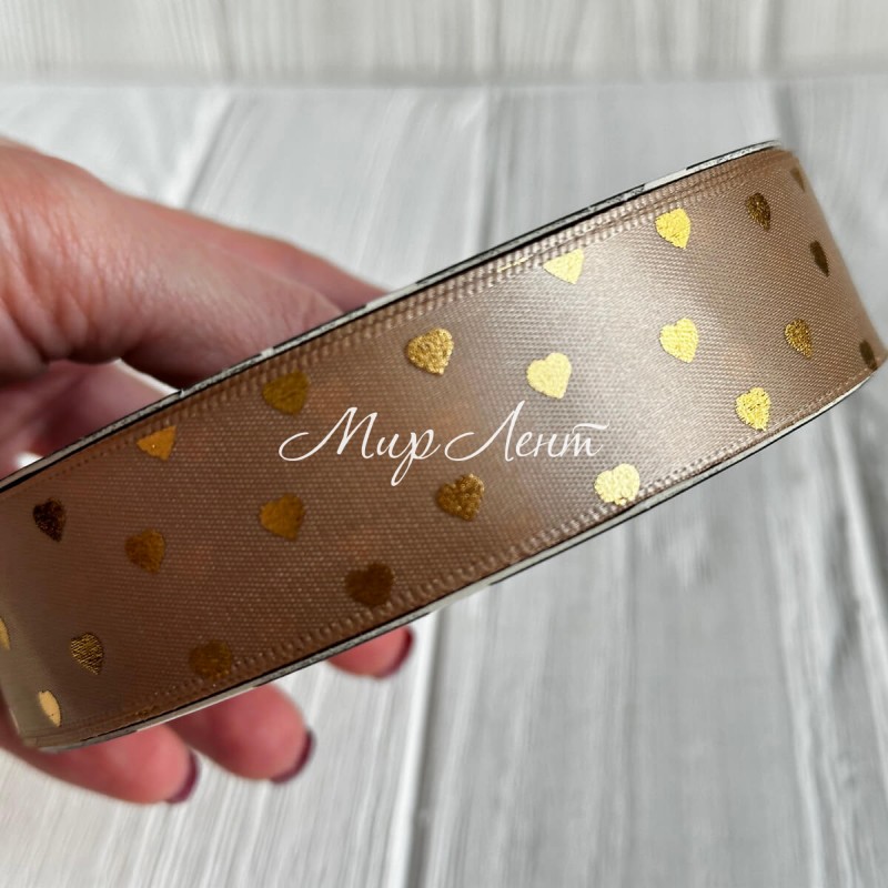 Лента атласная в золотое сердечко, 2,5 см, золото, рулон 30 м