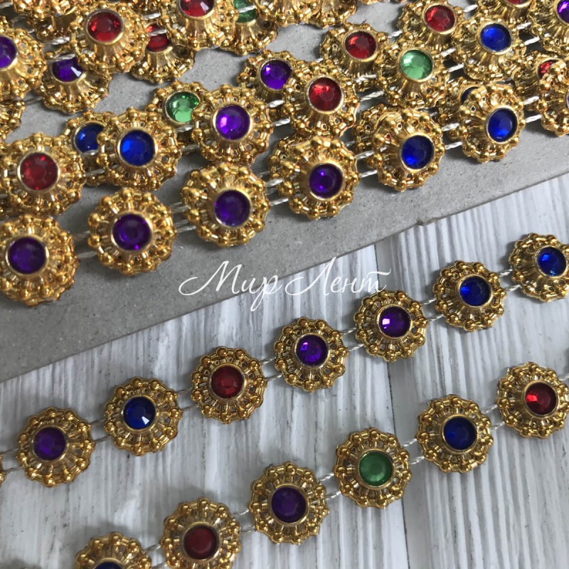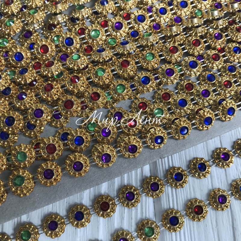 Лента-бусинка со стразами (№ 7643), золото, 10 мм, моток 9 м