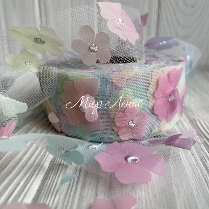 Лента из фатина с шифоновыми цветами, 4 см, желто-розовый, рулон 23 м