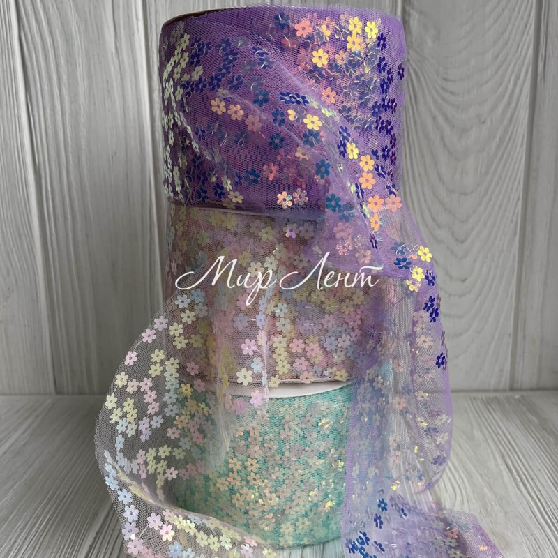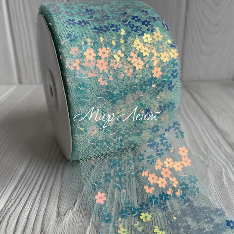 Лента из фатина з паетками, 7,5 см, мятный, рулон 23 м