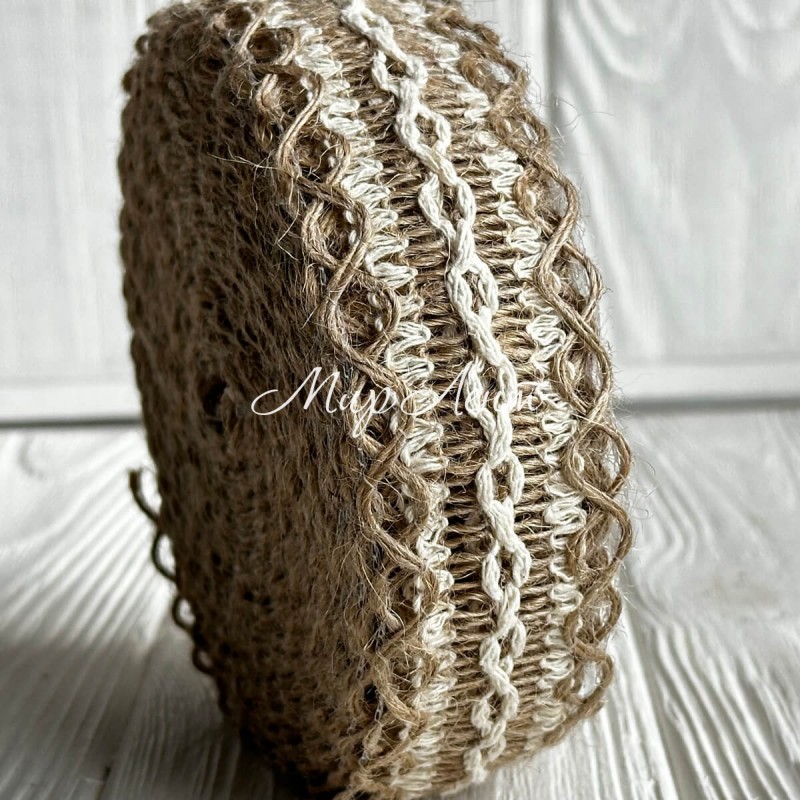 Лента-мешковина с вышитыми узором бесконечность, 3,5 см, натуральный с белым, рулон 10 м