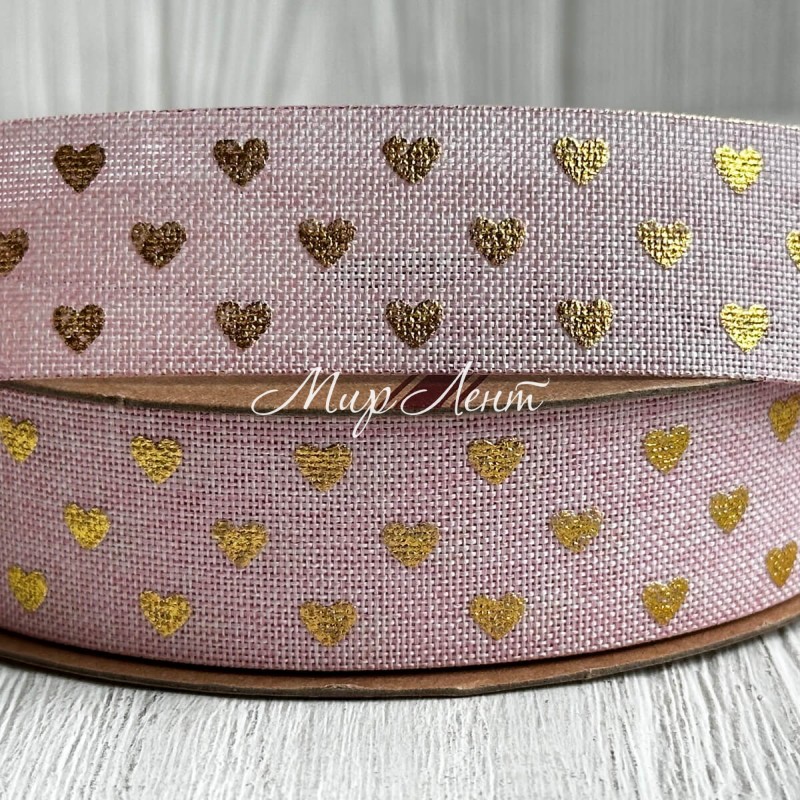 Лента мешковина с золотым сердечком, 2,5 см, светло-розовая, рулон 9 м