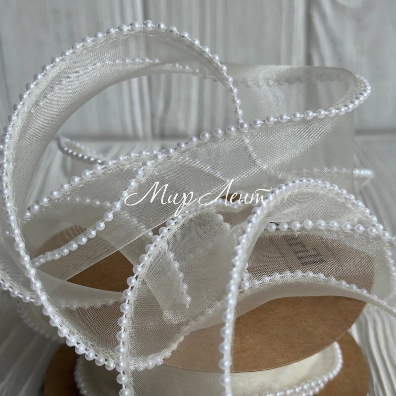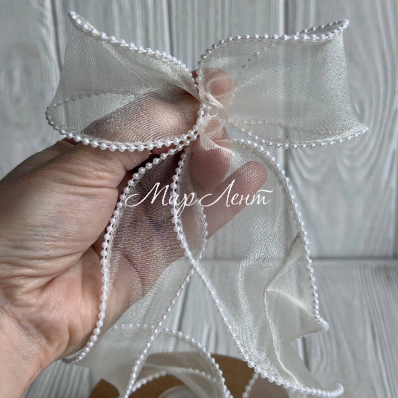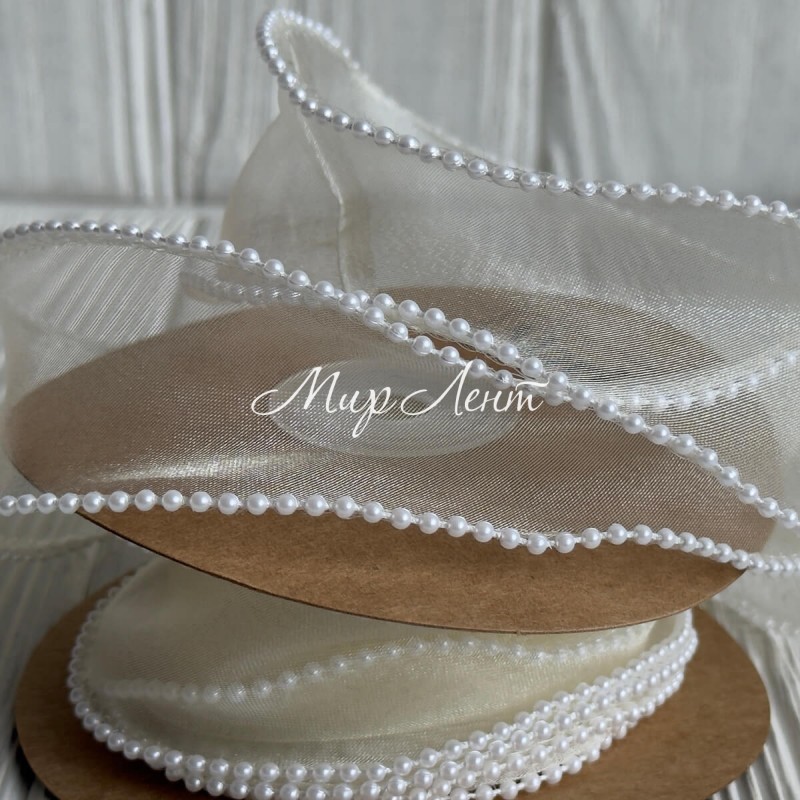 Лента с органзы с жемчужным кантом (D30333), 4 см, молочная, рулон 9 м