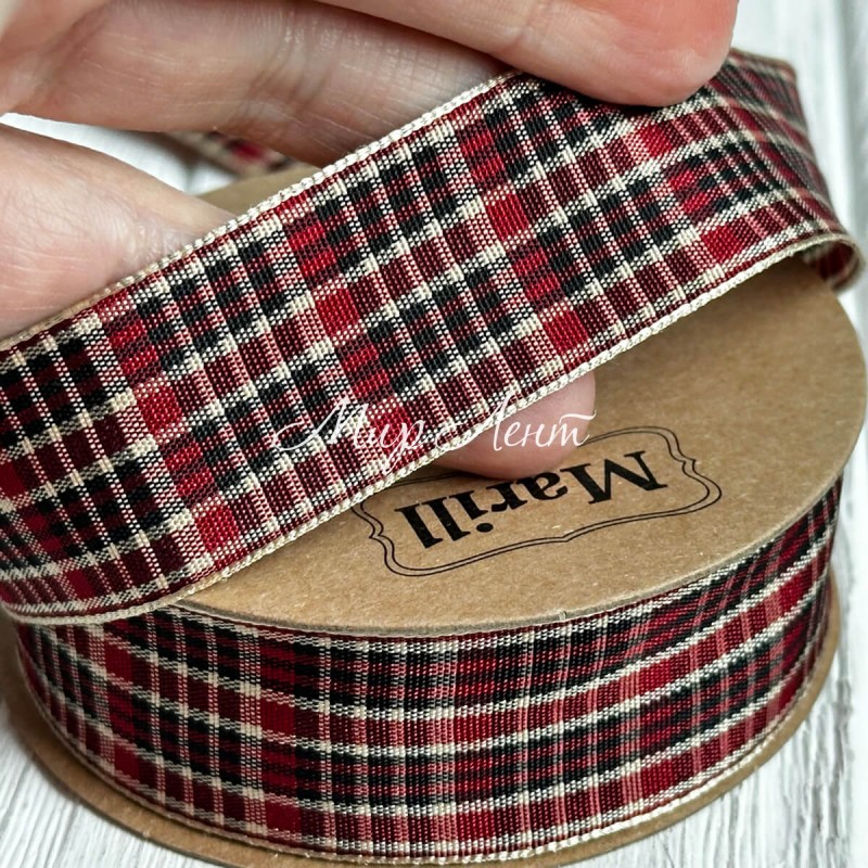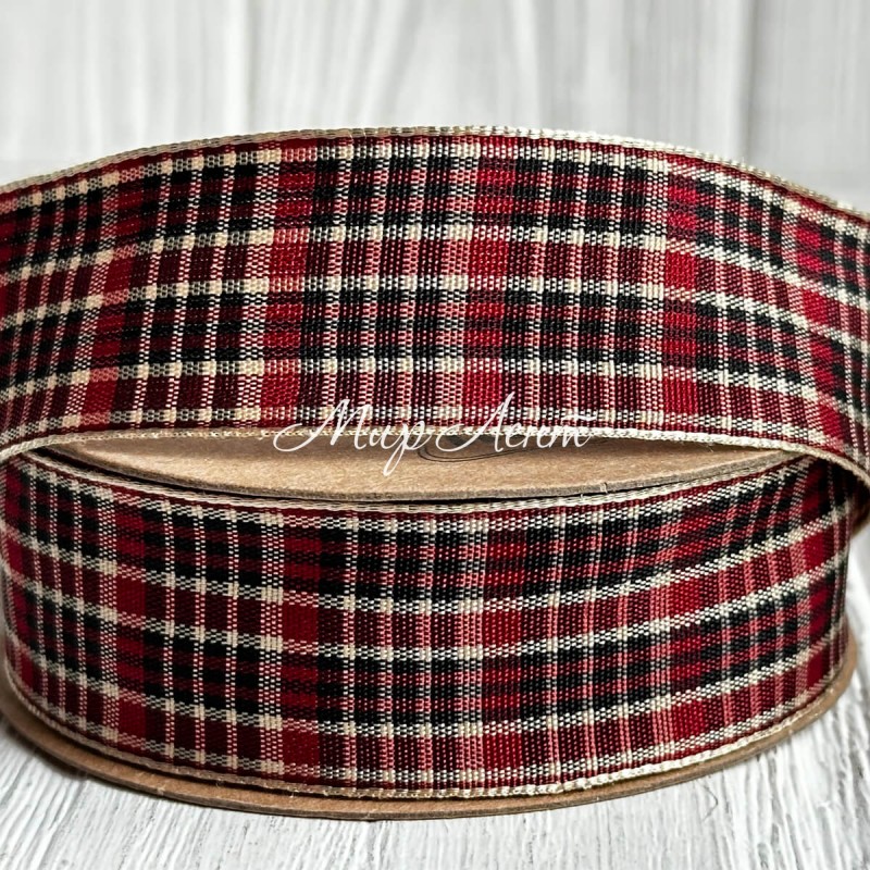 Лента шотландка, 2,5 см, бордово-бело-черная, рулон 18,5 м