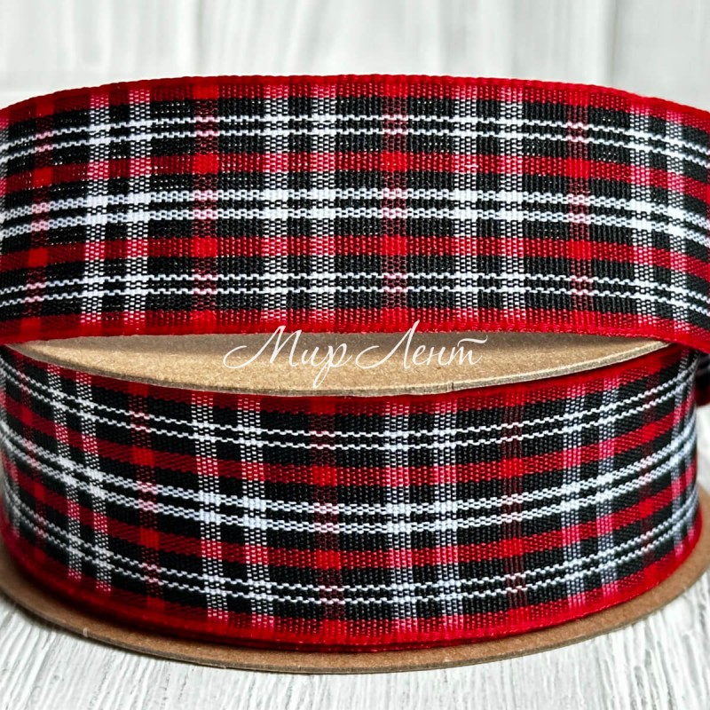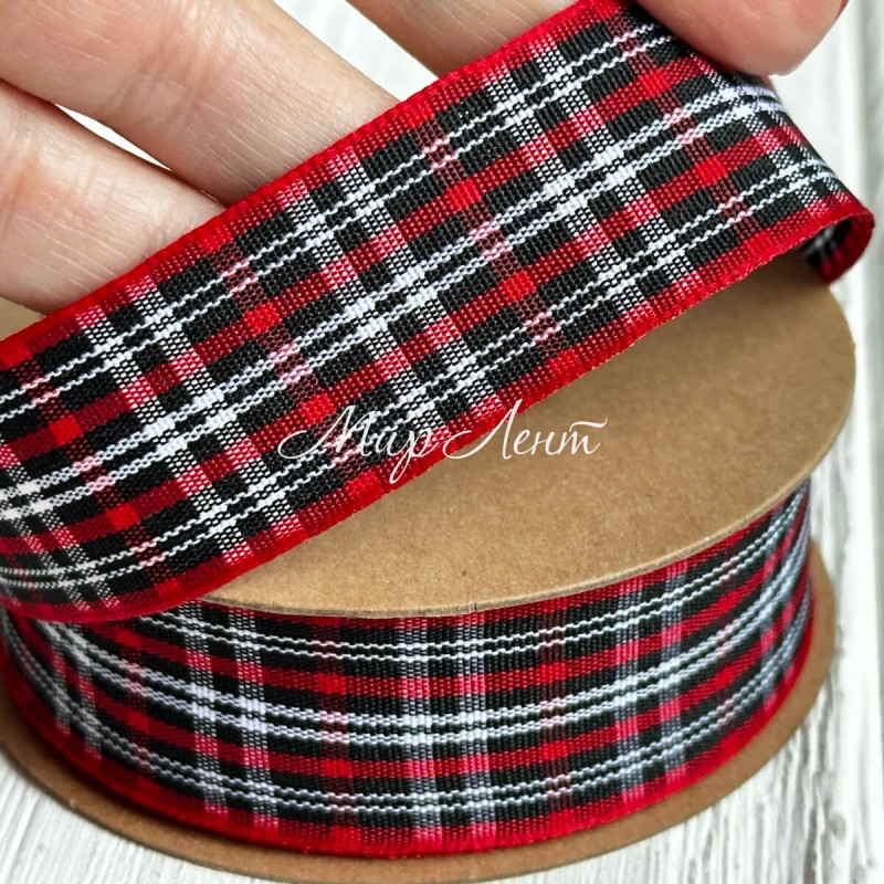 Лента шотландка, 2,5 см, красно-бело-черная, рулон 18,5 м