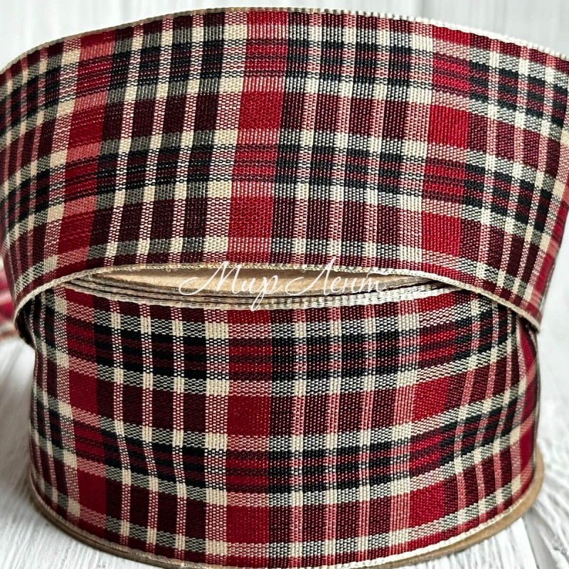 Лента шотландка, 4 см, бордово-бело-черная, рулон 18,5 м