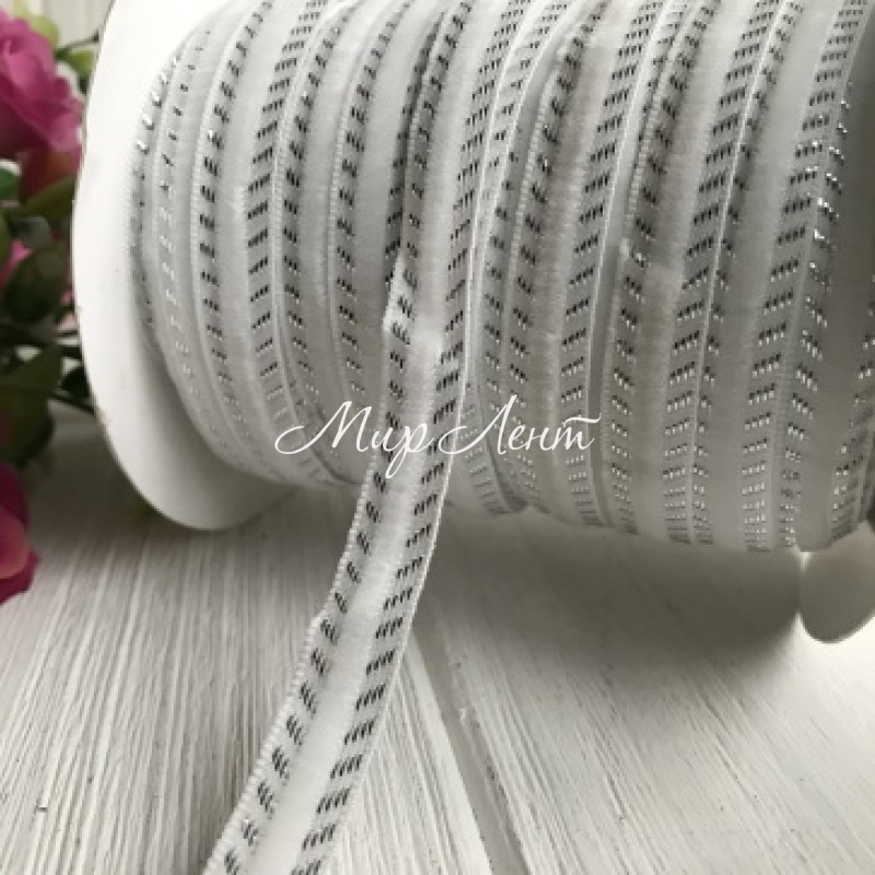 Лента велюр кантовый узор, 1 см, белый с серебром, рулон 45 м