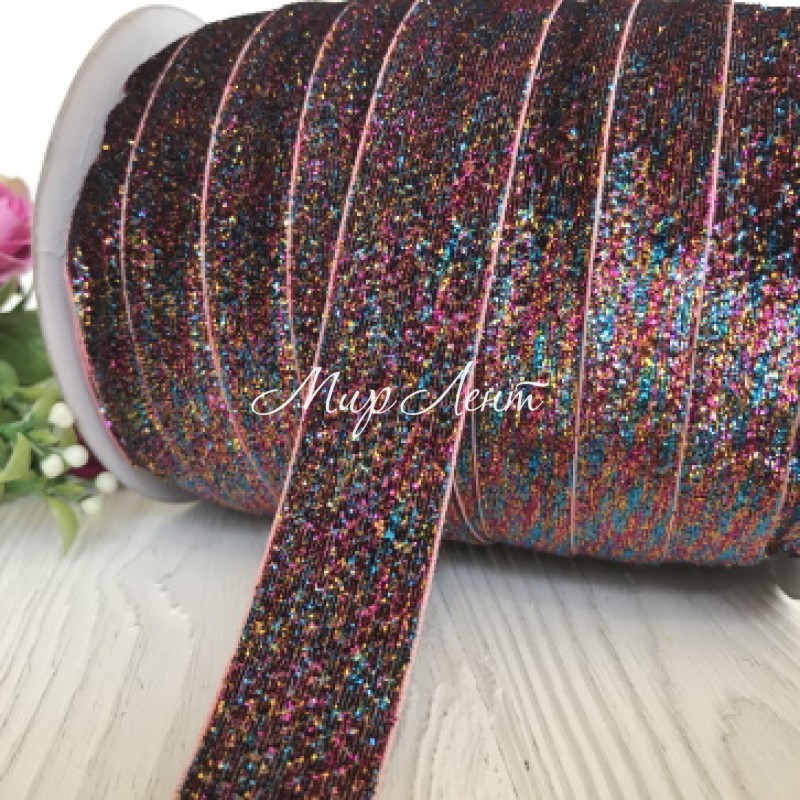 Лента велюр омбре с люрексом, 2,5 см, бирюзово-золотой, рулон 45 м
