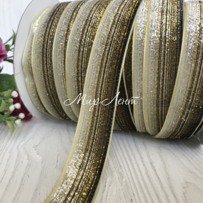Лента велюр омбре с люрексом, 2,5 см, светлое золото, рулон 45 м