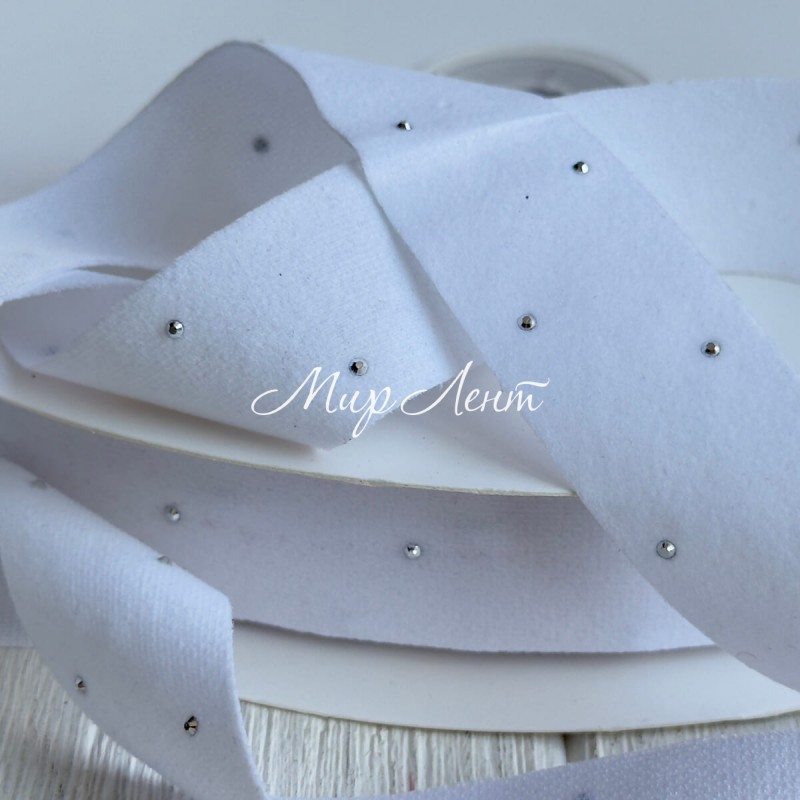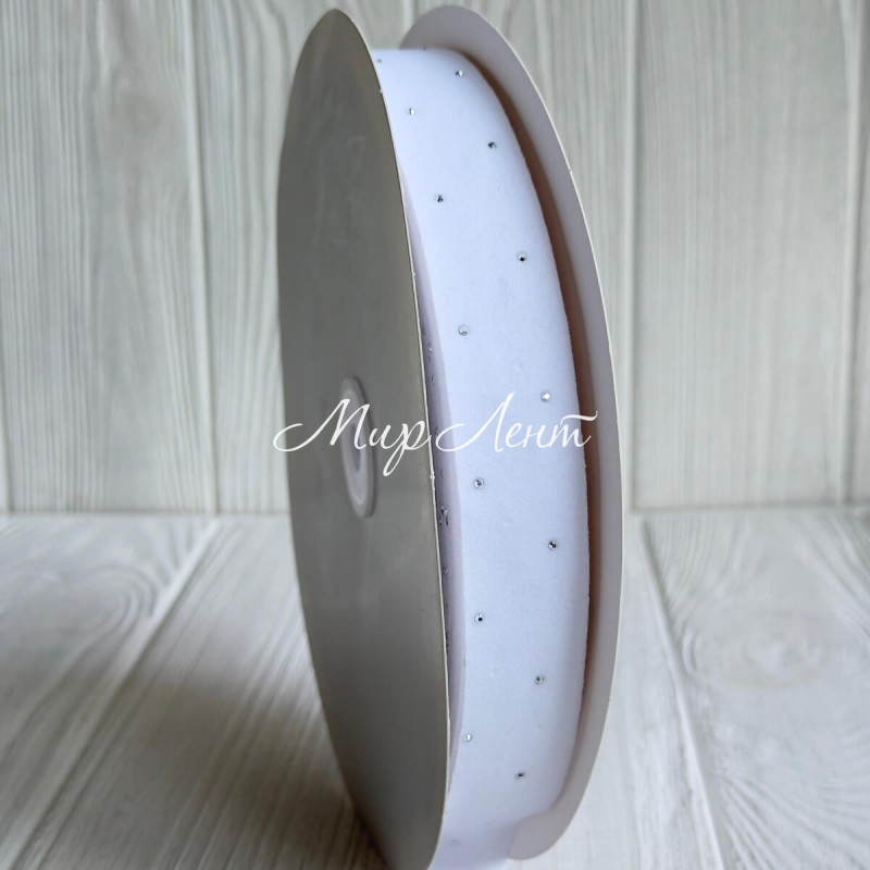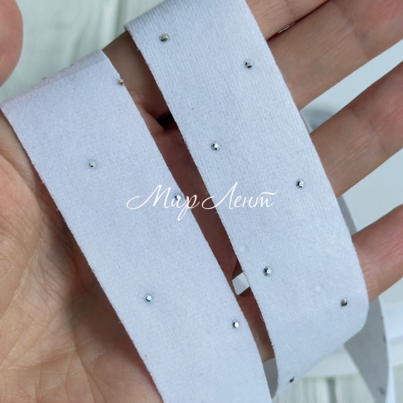 Лента велюр со стразами, 2,5 см, белая, рулон 45 м