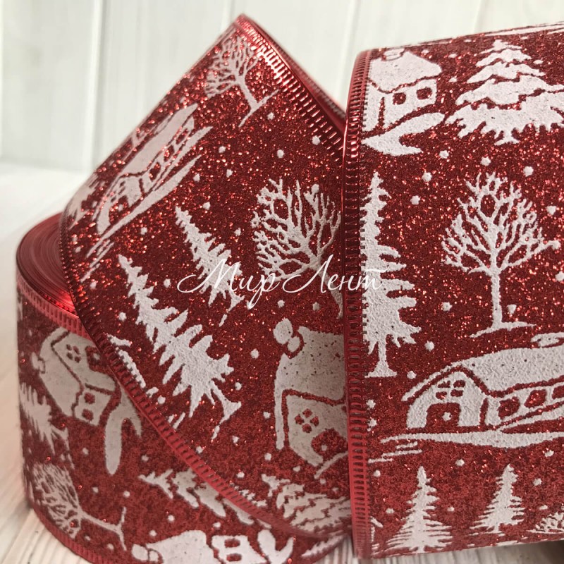 Новогодняя лента блеск с домиком, 6,3 см, красная, рулон 23 м