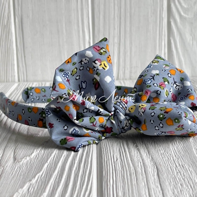 Обруч софт бант в цветочек, 2,5 см, серый с хлопком, шт.