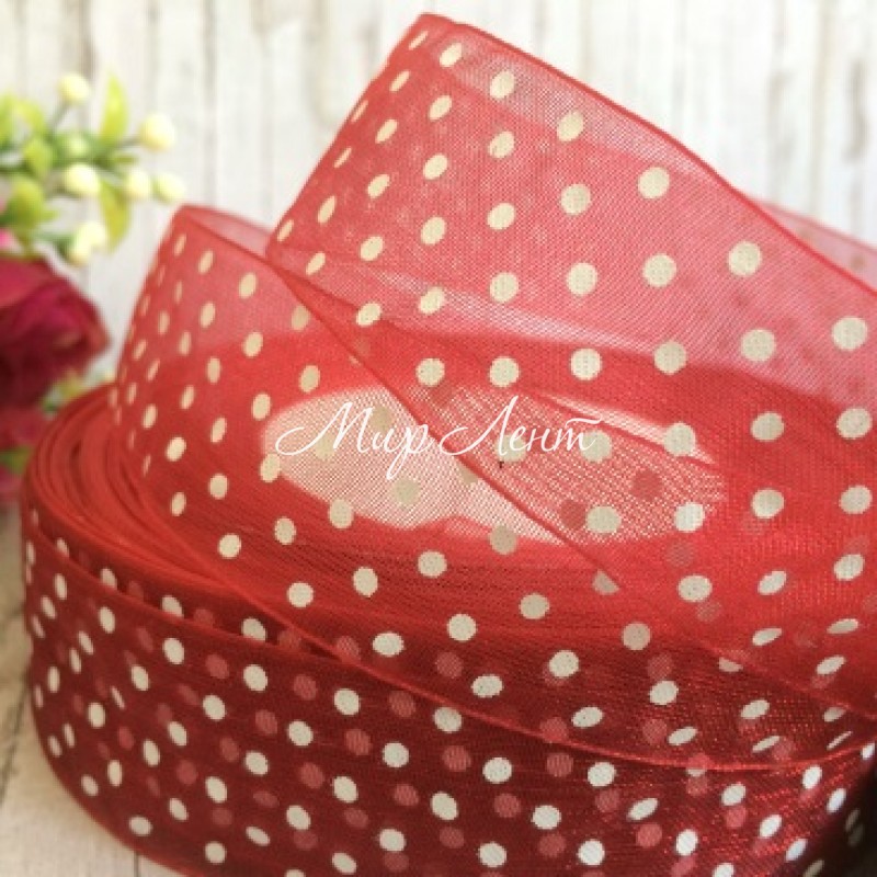 Органза 2,5 см, горох, красный бархат, рулон 45 м