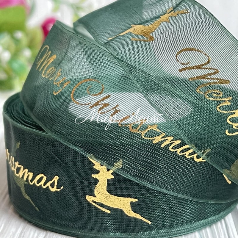 Органза 2,5 см, Merry Christmas с оленем, темно-зеленый, рулон 23 м