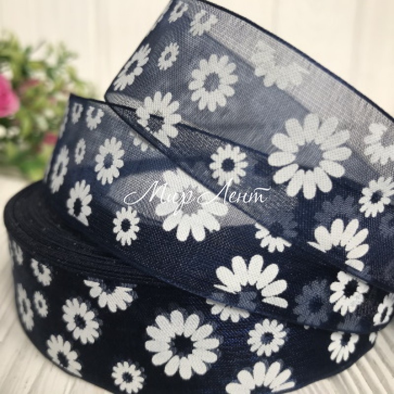 Органза 2,5 см, ромашка, сапфировый, рулон 45 м
