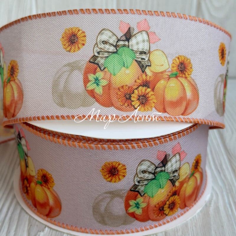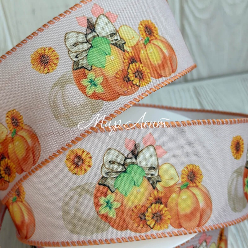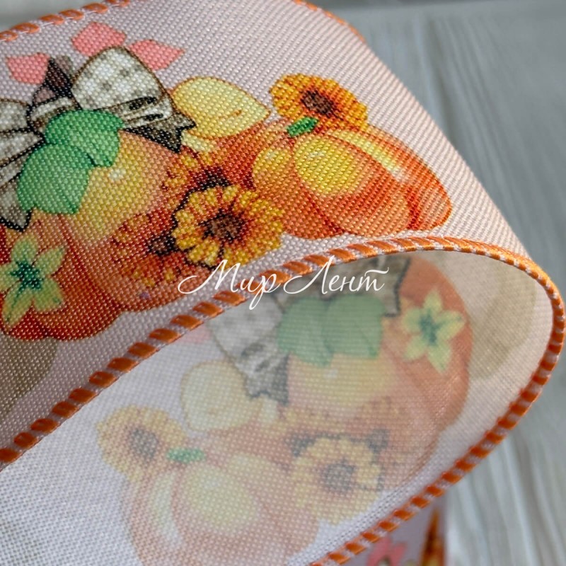Осенняя лента с проволочным кантом, 6,3 см, бежевая с тыквами, рулон 18 м