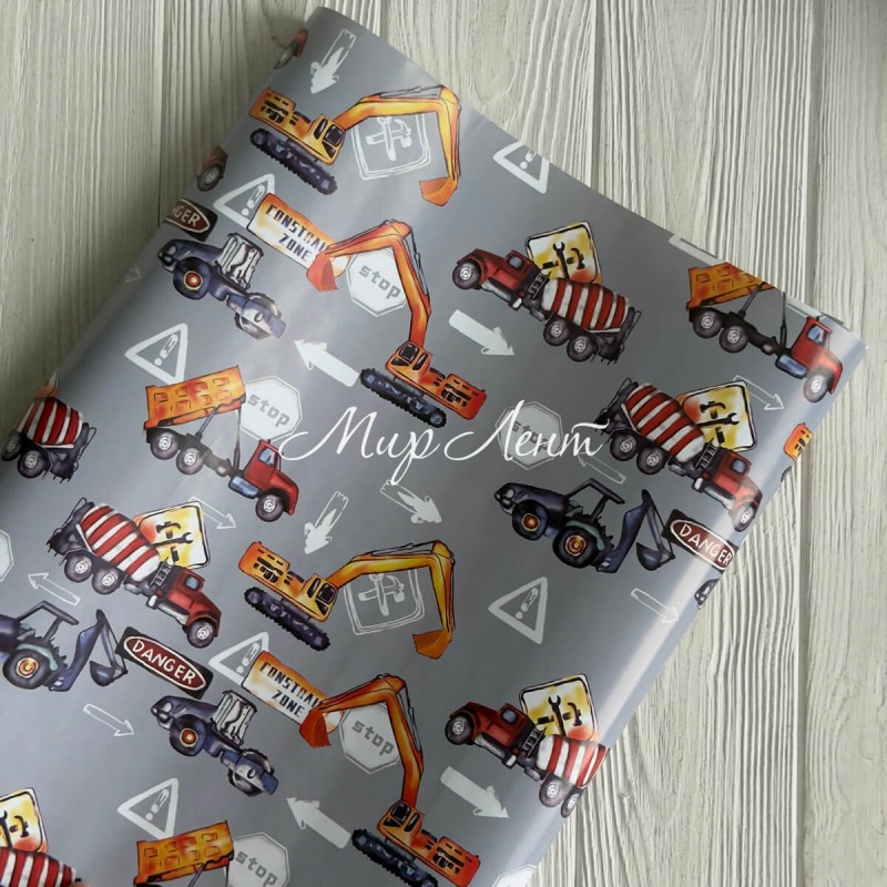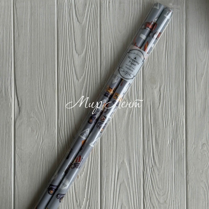 Подарочная бумага, 70х100 см, серая с грузовыми машинками, упаковка 2 шт.