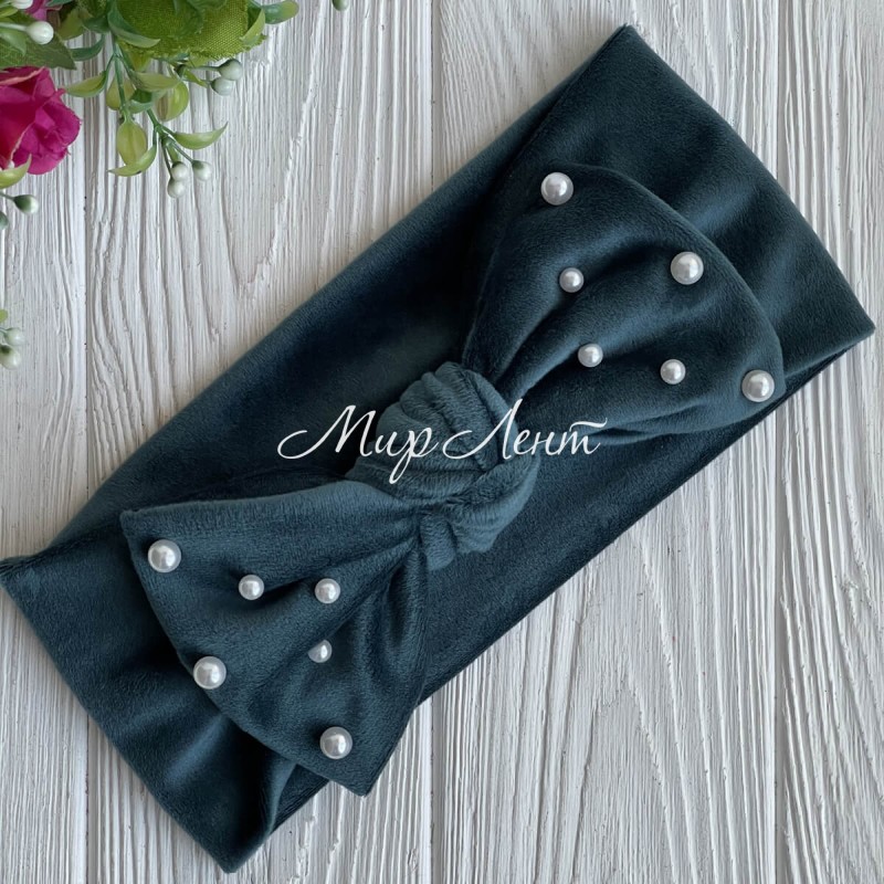 Повязка спорт велюр бант с жемчугом, 9,5 см, изумрудный, шт.
