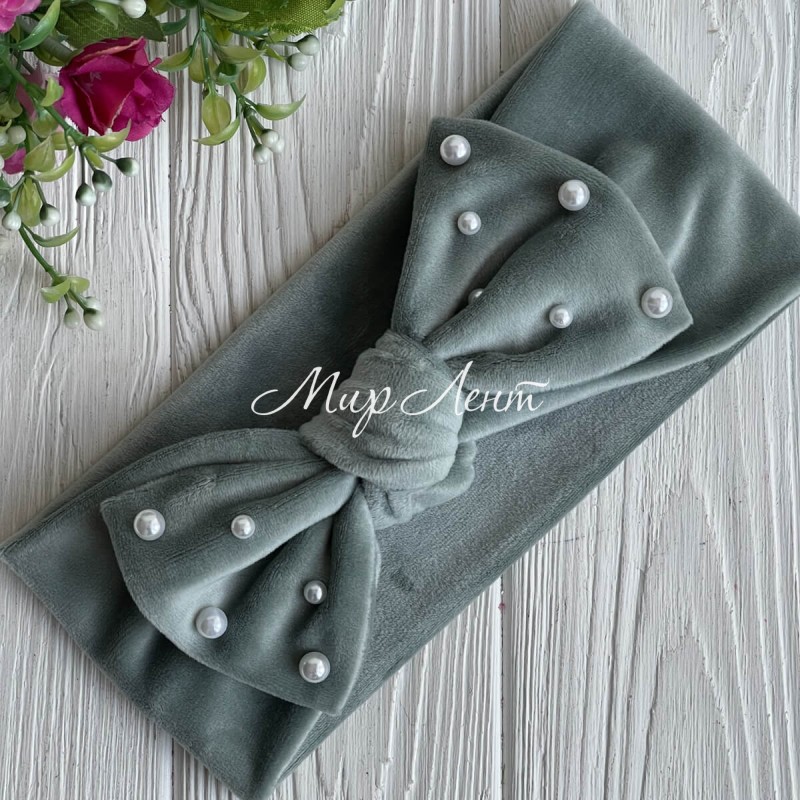 Повязка спорт велюр бант с жемчугом, 9,5 см, мятный, шт.